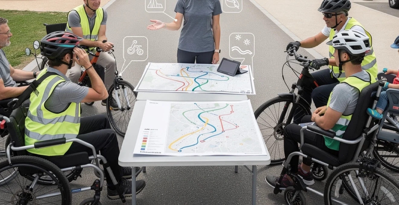 Dans les deux cas, l’accessibilité des interfaces (joystick, commandes d’add-on, systèmes de freinage) doit être analysée en amont, en particulier pour les personnes présentant des limitations de préhension. Une attention particulière est portée aux zones de transfert : parkings, gares, aires de repos doivent permettre un transfert fauteuil/vélo adapté en toute sécurité. Enfin, la constitution de binômes de sécurité (un accompagnant dédié par utilisateur de fauteuil roulant sur les sections sensibles) renforce considérablement la sérénité du groupe.
